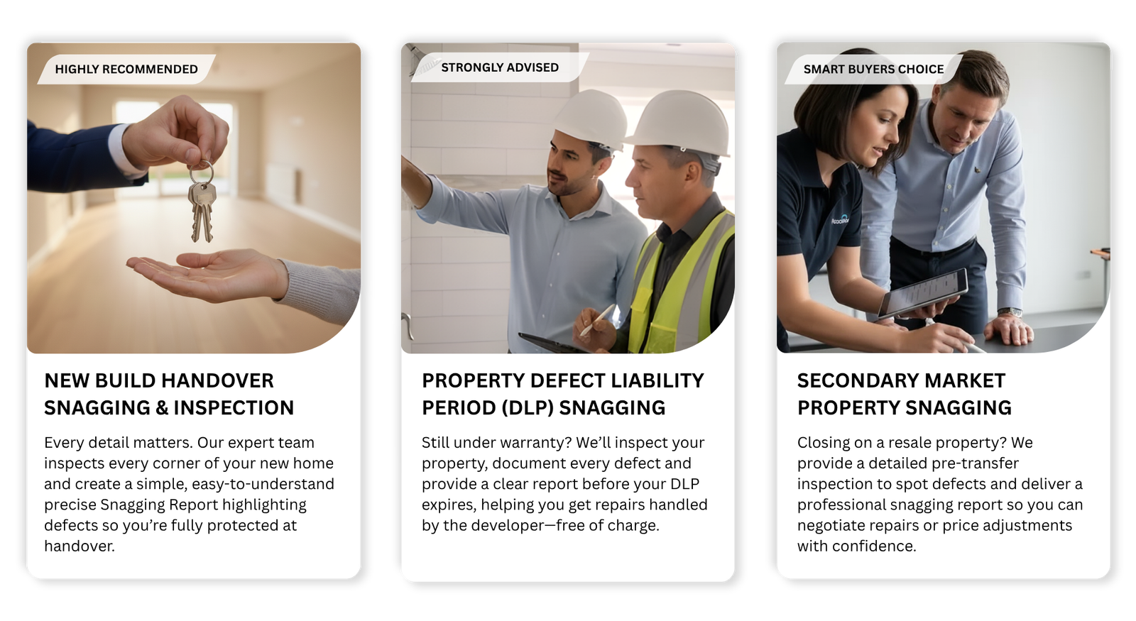 The best time to engage a property snagging company is just before the final handover or move-in. This ensures a comprehensive inspection, so any defects or unfinished work can be identified and addressed by the developer or contractor. By doing this, you can make sure your property aligns with your expectations and contractual requirements. Typically, your developer will inform you about the snagging and orientation schedule—this is the ideal moment to reach out to us.