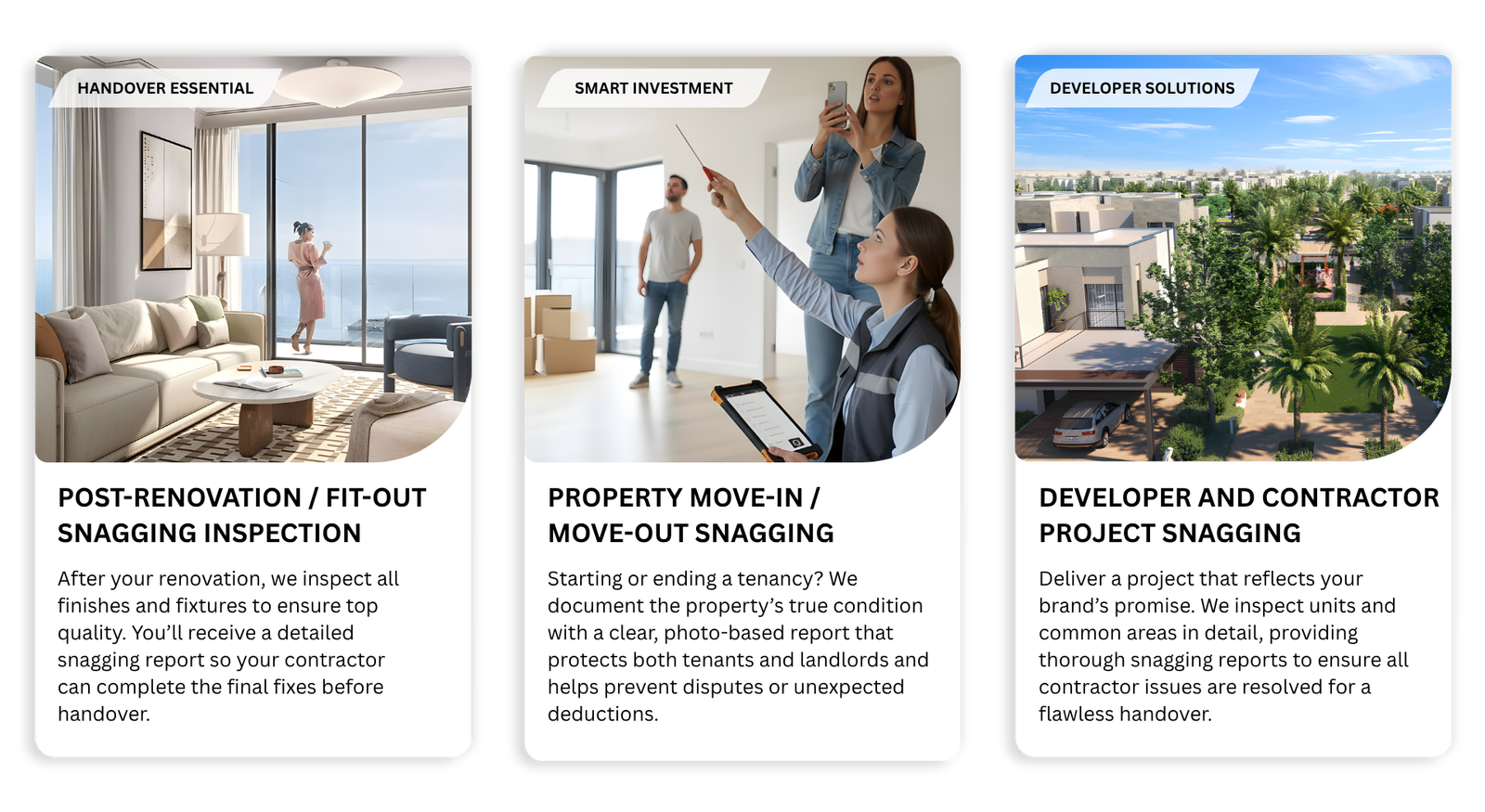 In UAE’s fast-growing real estate market, property snagging has become essential. It allows buyers, investors, and tenants to verify that their properties are completed to a high standard, free from defects, and fully functional. By identifying issues early, snagging helps protect investments, ensures safety, and guarantees a smoother move-in experience.