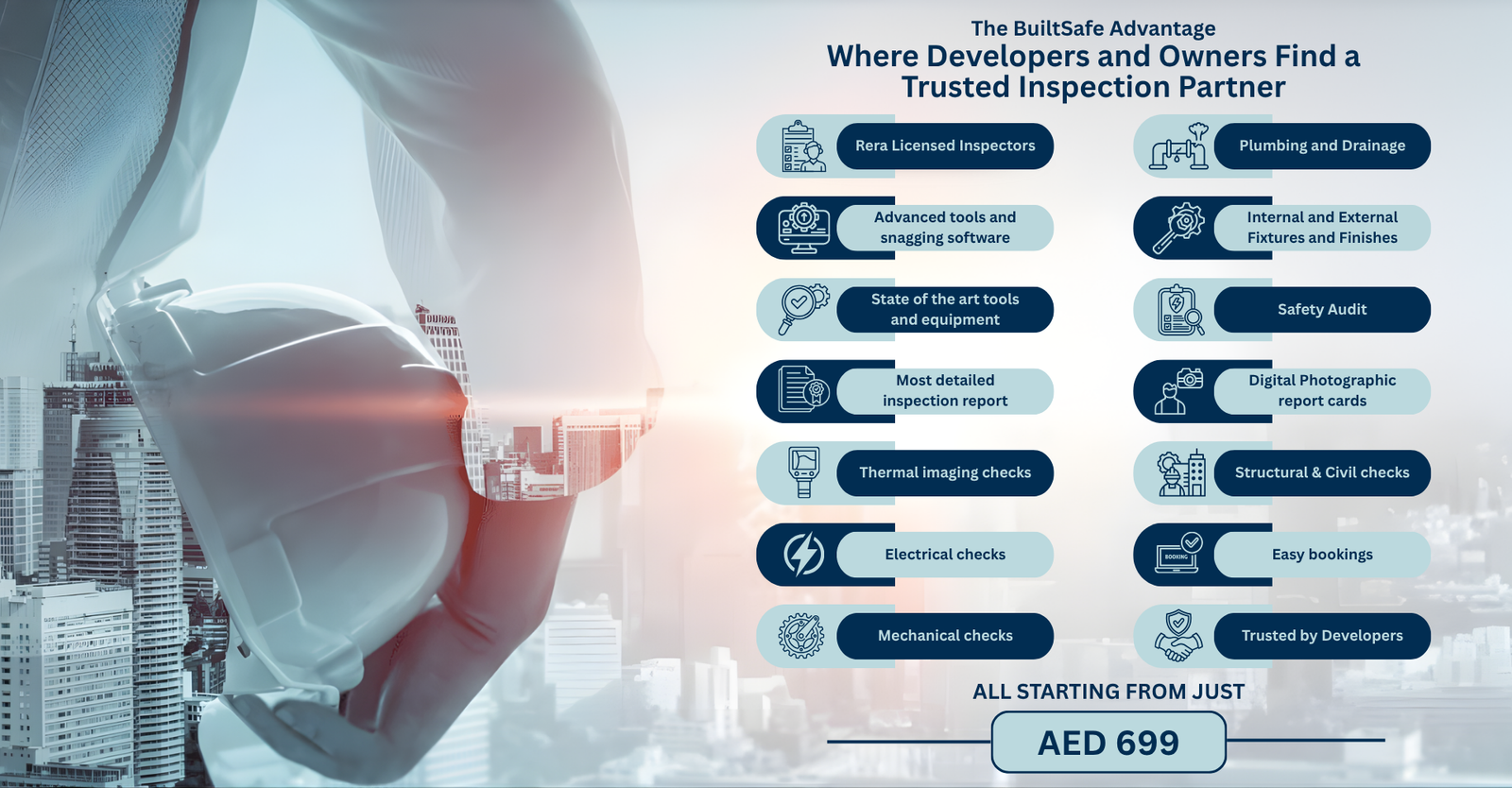 Built Safe stands out as one of the UAE’s most trusted snagging specialists, holding DED licensing, RERA approval, and InterNACHI certification. Homeowners and developers rely on us for comprehensive inspections that follow the highest international standards.