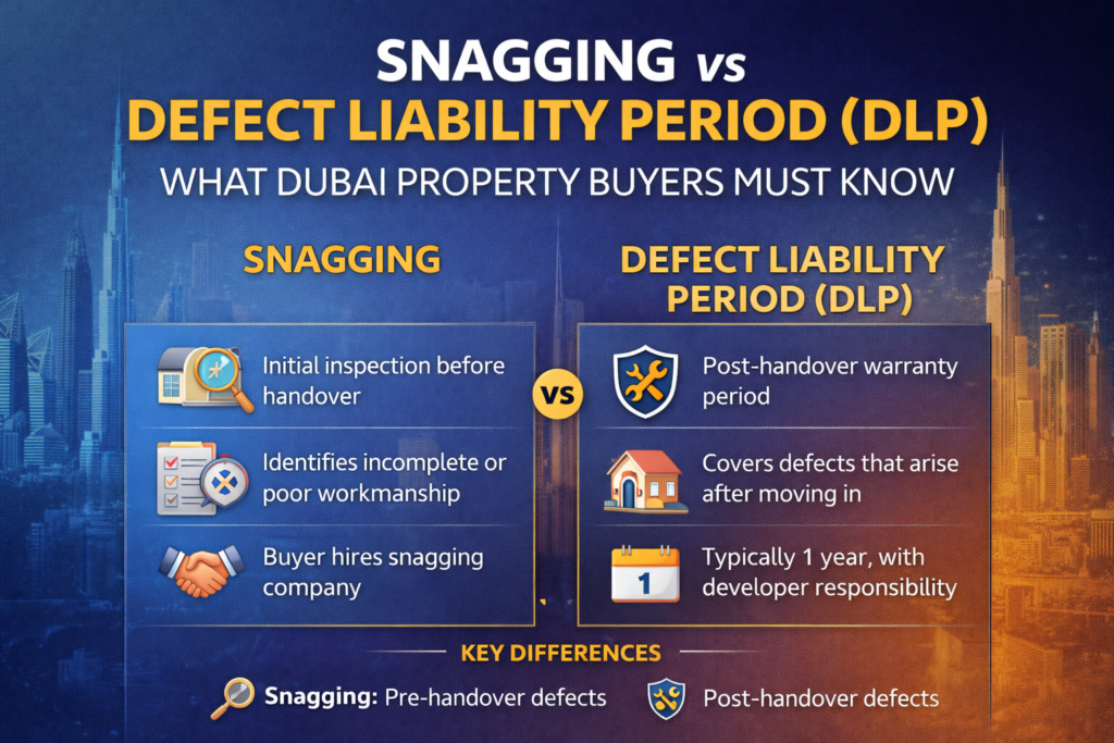Buying a property in Dubai is a major investment, whether it’s for personal use or rental income. During the handover stage, buyers often hear two important terms: Snagging and Defect Liability Period (DLP). While they are closely related, they serve different purposes. Understanding the difference between snagging and DLP can help you protect your investment and avoid costly repairs later.